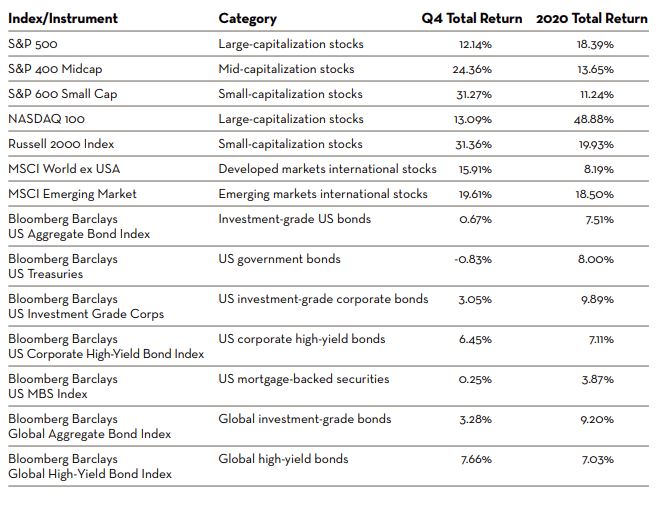 There was nothing normal about 2020, and the final quarter was no exception. Investment markets closed the year with their best quarterly performance, fueled by the arrival of multiple vaccines, the Fed’s continued and substantial support, and a fresh round of fiscal stimulus. Despite a splintered economy, political dysfunction, social unrest, and virus surges, capital markets exhibited great resilience by brushing off near-term challenges and looking forward to a more robust and vibrant economy in 2021.